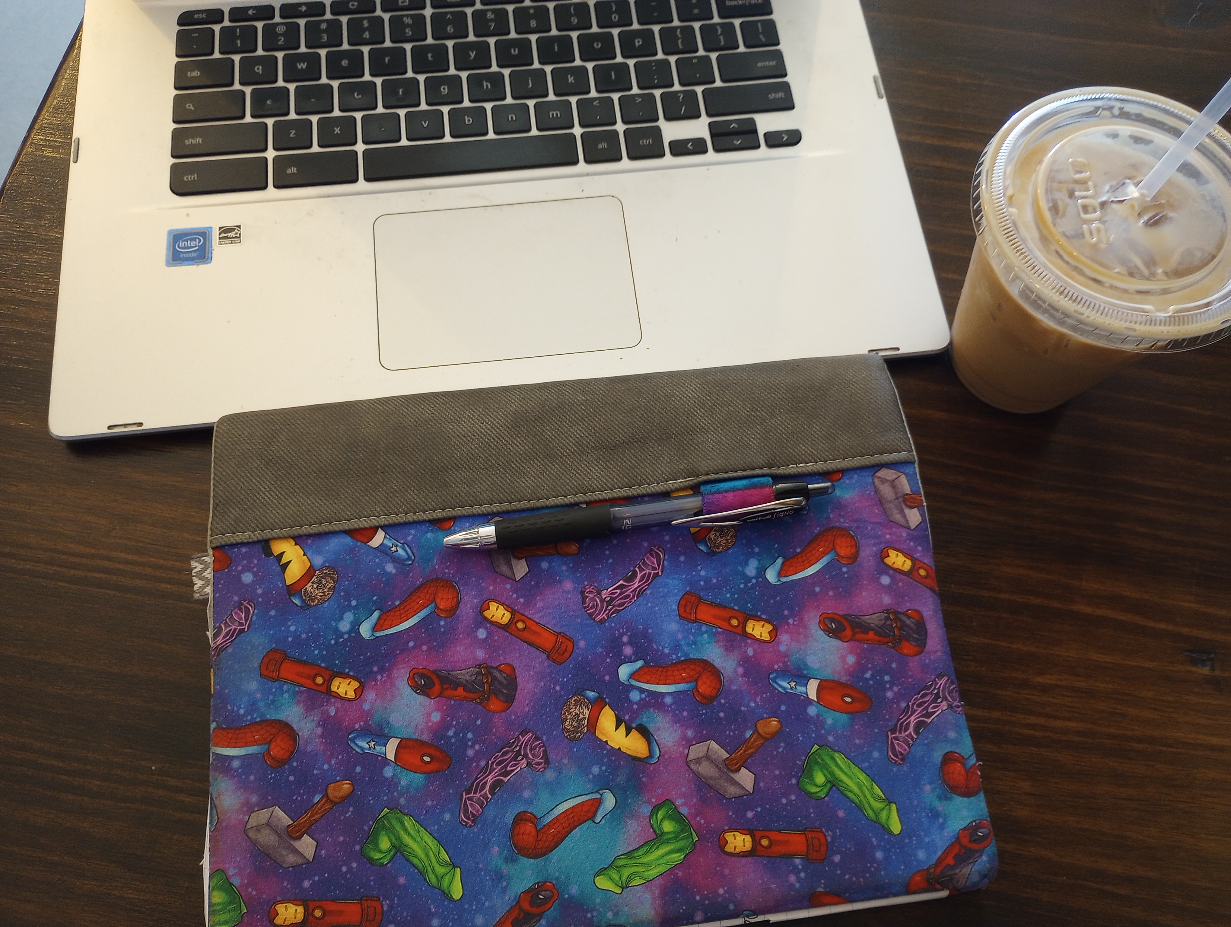 Although I use my laptop to write 95% of the time, some days I just want to whip out my pen and fun superhero penis notebook my friend gifted me 🙂 and write pen and paper style.